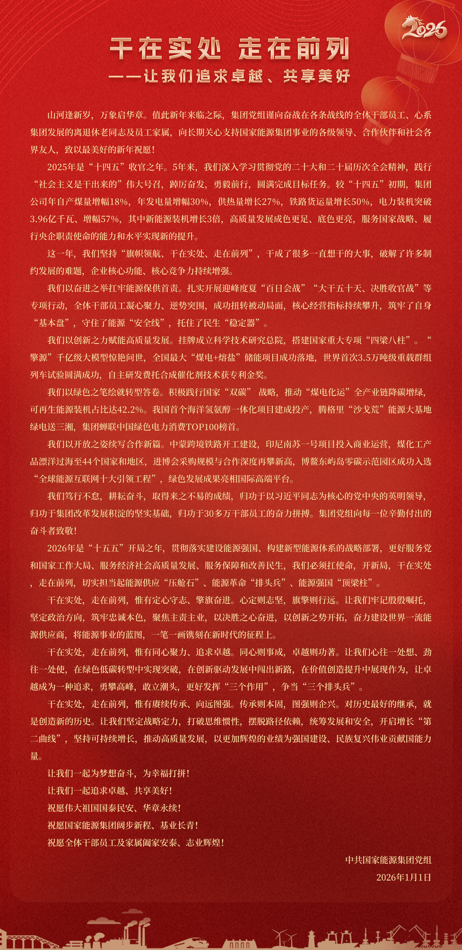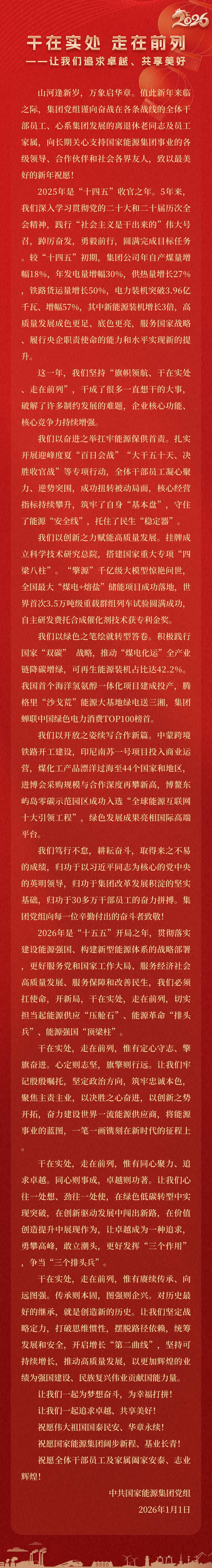 國家能源集團(tuán)胸懷“國之大者”,增產(chǎn)增供、穩(wěn)價(jià)穩(wěn)市,積極服從服務(wù)國家戰(zhàn)略、保障國家能源安全、助力國民經(jīng)濟(jì)穩(wěn)增長,推動煤炭安全綠色智能、煤電清潔高效穩(wěn)定、現(xiàn)代煤化工高端多元低碳、運(yùn)輸物流協(xié)同一體、新能源多元創(chuàng)新規(guī)?;l(fā)展,全力擔(dān)當(dāng)能源強(qiáng)國頂梁柱,能源供應(yīng)壓艙石,能源革命排頭兵。